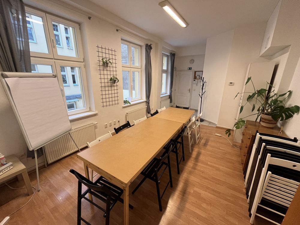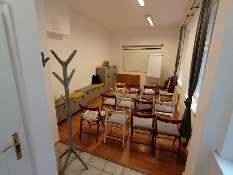 Menší místnost v prvním patře domu. Ideální je pro setkání 10 – 20 lidí (záleží na rozložení židlí). U klubovny je vlastní sociální zařízení a čajová kuchyňka s rychlovarnou konvicí.