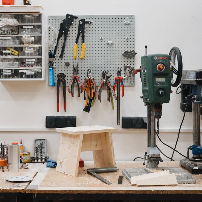 V kutilské dílně si můžeš třeba vyrobit věšák na zeď, poličku nebo přečalounit židli. Přímo sousedí s výtvarnou dílnou, ale jedná se o prašnější prostor, uzpůsobený pro řezání, broušení, lakování… Najdeš zde nejen drobné nářadí, ale třeba i cirkulárku nebo stojanové vrtačky.
