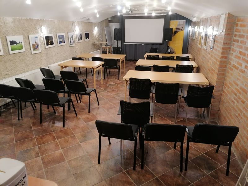 K dispozici je projektor, plátno, flipchart, ozvučení, mixážní pult a mikrofony, wi-fi, 7 rozkládacích stolů a 20 polstrovaných a 50 skládacích židlí.
